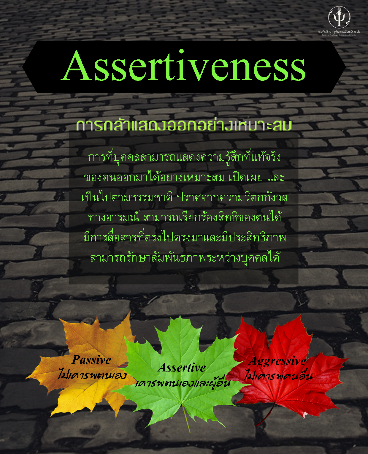 - การแสดงออกซึ่งความไม่เห็นด้วยอย่างชัดเจน – เมื่อบุคคลมีความคิดเห็นที่ไม่ตรงกับผู้อื่น บุคคลสามารถแสดงความไม่เห็นด้วย โดยสามารถแสดงความคิดเห็นที่แตกต่างออกไป บอกความคิดและความรู้สึกของตนได้