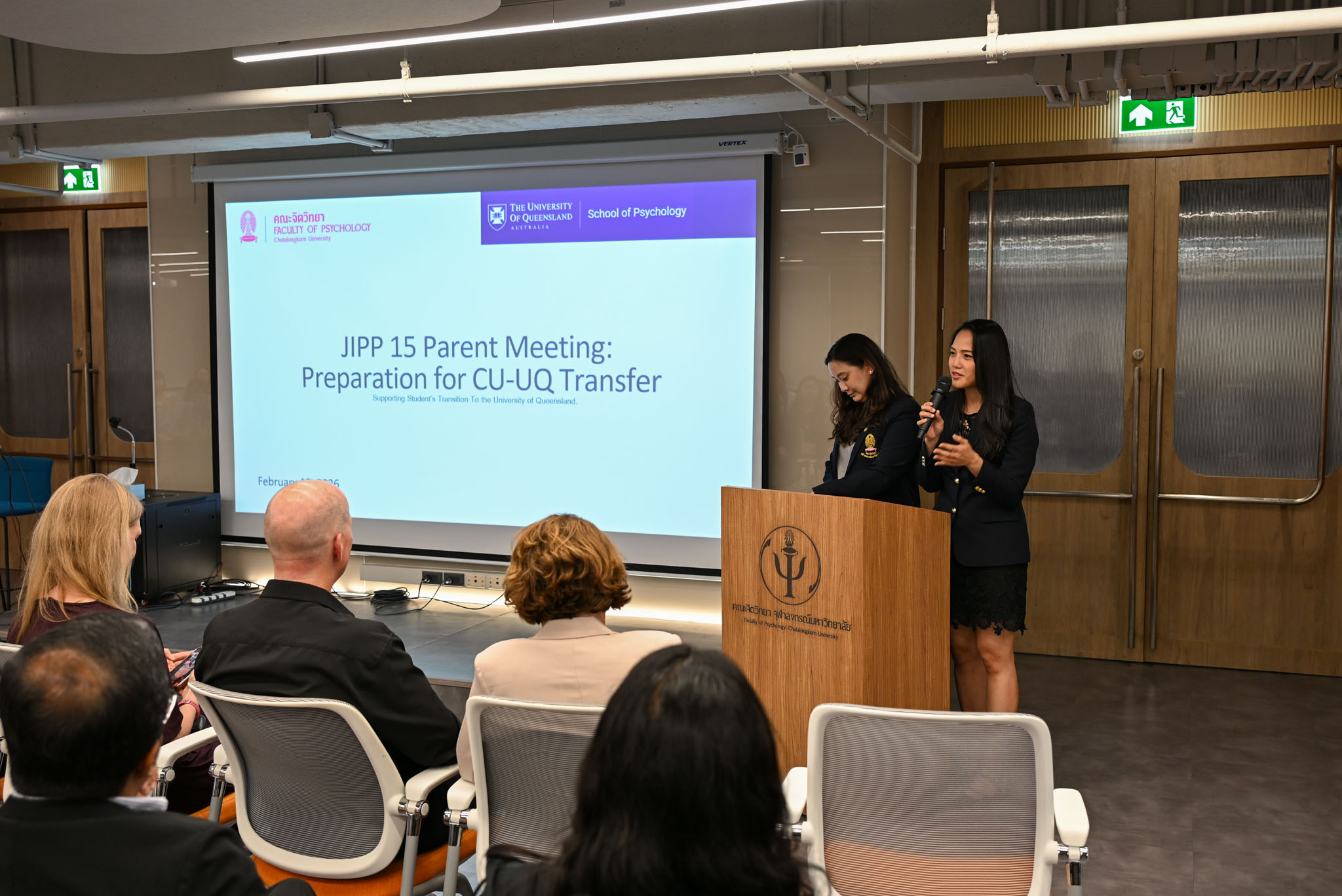 เมื่อวันที่ 13 กุมภาพันธ์ 2569 หลักสูตร Joint International Psychology Program (JIPP) จัดกิจกรรม “Parent Meeting for JIPP15 Students” ณ คณะจิตวิทยา จุฬาฯ อาคารบรมราชชนนีศรีศตพรรษ ชั้น 4 เพื่อเตรียมความพร้อมให้แก่นิสิตก่อนการโอนย้ายไปศึกษาต่อที่ The University of Queensland ในภาคการศึกษาถัดไปเป็นเวลา 1.5 ปี โดยได้รับเกียรติจาก ผศ. ดร.ณัฐสุดา เต้พันธ์คณบดี ผศ. ดร.พจ ธรรมพีร ผู้อำนวยการหลักสูตร JIPP และ อ. ดร.สุภสิรี จันทรวรินทร์ กรรมการหลักสูตร ร่วมให้ข้อมูล พร้อมด้วยผู้แทนจาก UQ ได้แก่