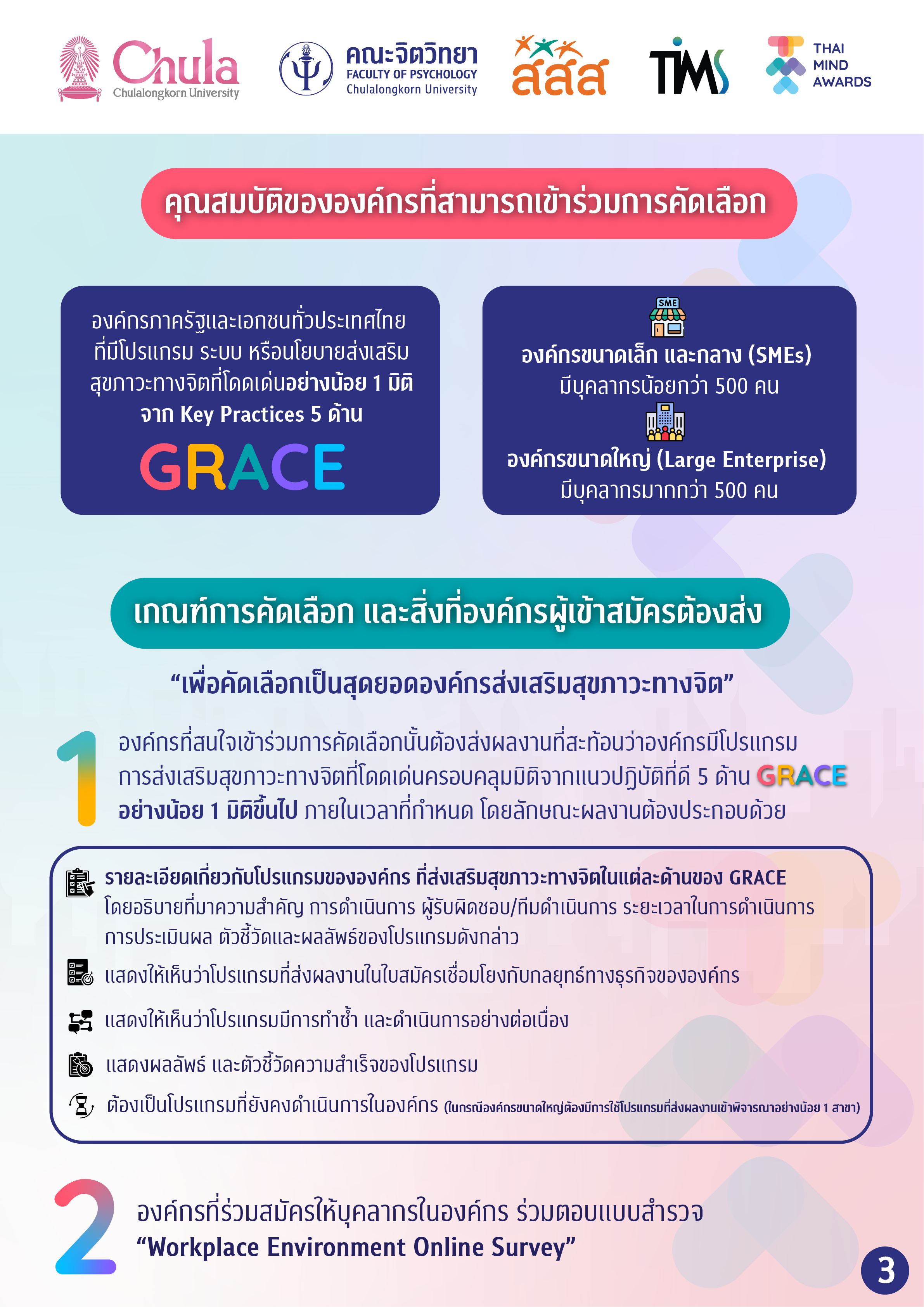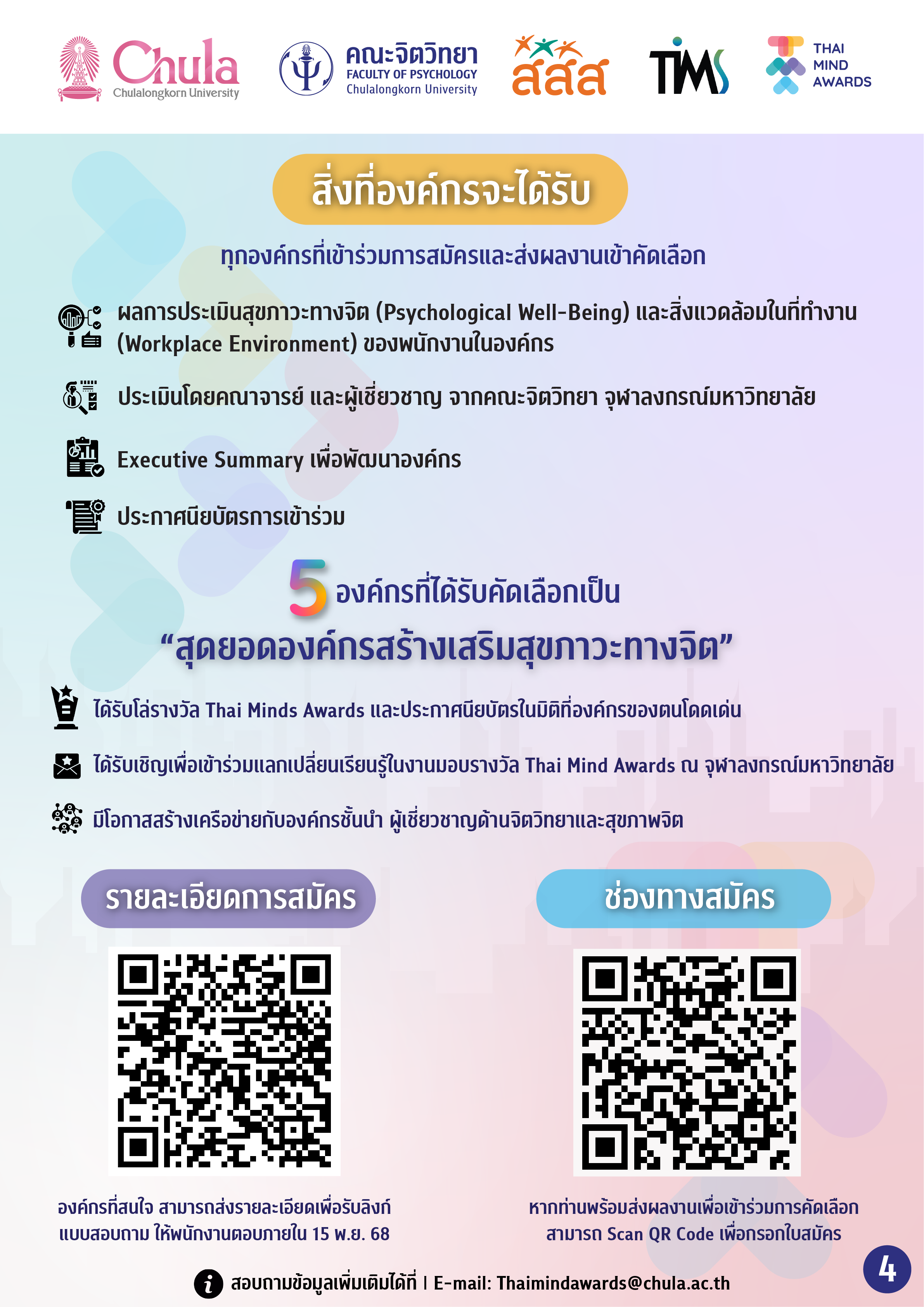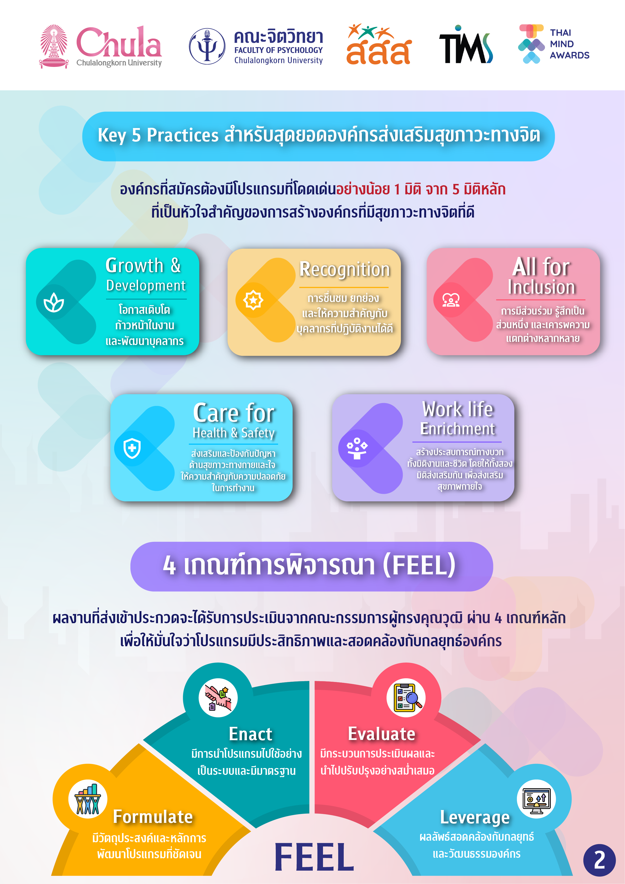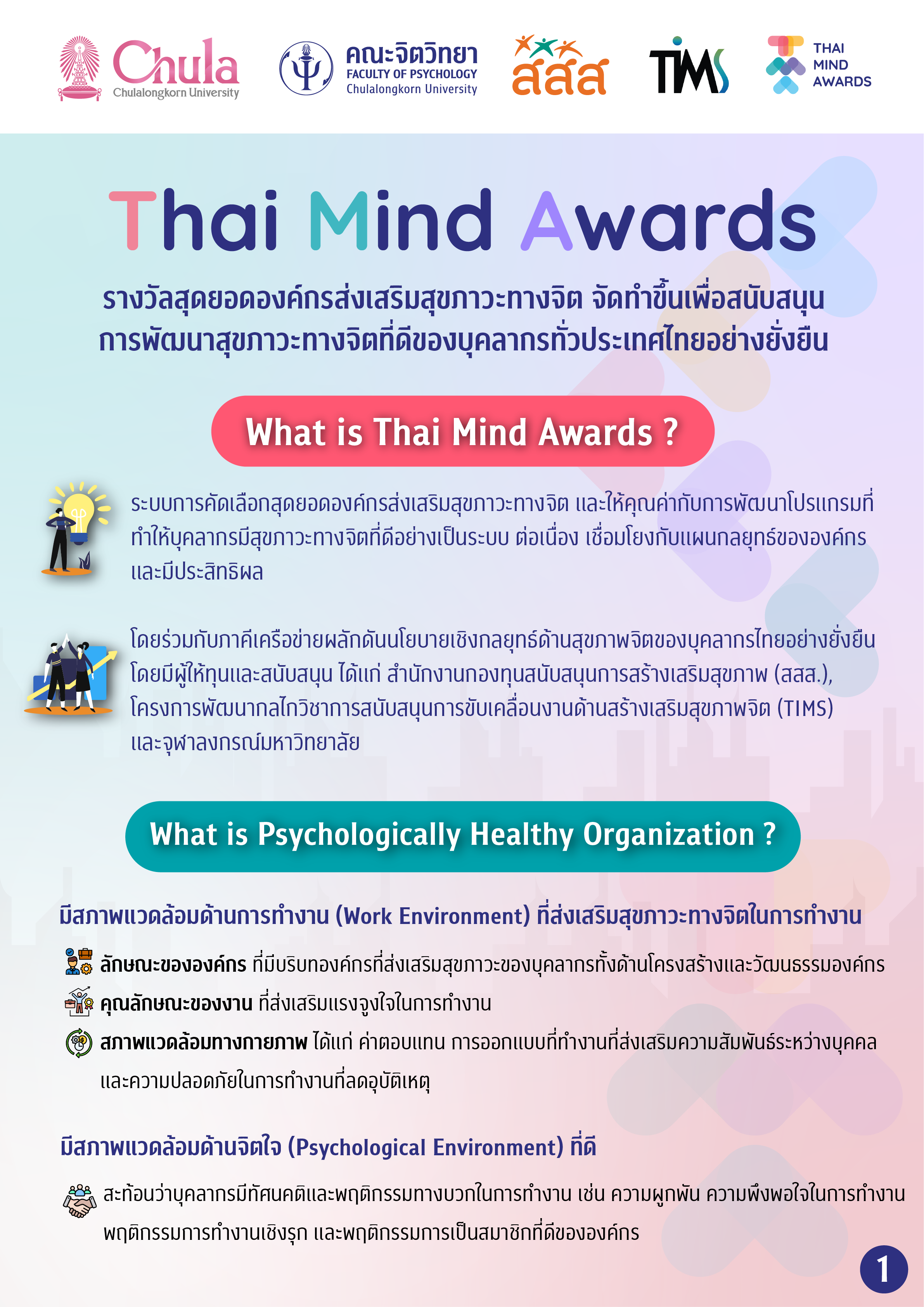 คณะจิตวิทยา จุฬาลงกรณ์มหาวิทยาลัย ร่วมกับสถาบันวิชาการเพื่อความยั่งยืนทางสุขภาพจิต (TIMS) โดยความสนับสนุนของ สสส. เปิดรับสมัครองค์กร เพื่อร่วมคัดเลือกให้เป็น “สุดยอดองค์กรสร้างเสริมสุขภาวะทางจิต” เพื่อเป็นต้นแบบองค์กรดีเด่นด้านการส่งเสริมสุขภาวะที่ดีของพนักงานให้แก่องค์กรอื่น ๆ ภายใต้โครงการ Thai Mind Awards ที่ได้รับการตอบรับเป็นอย่างดีในปีที่ผ่านมา โดยมีองค์กรเข้าร่วมสมัครกว่า 50 องค์กร และมีบุคลากรกว่า 2,000 คนร่วมสะท้อนความคิดเห็นเกี่ยวกับนโยบายสุขภาวะทางจิตในองค์กร