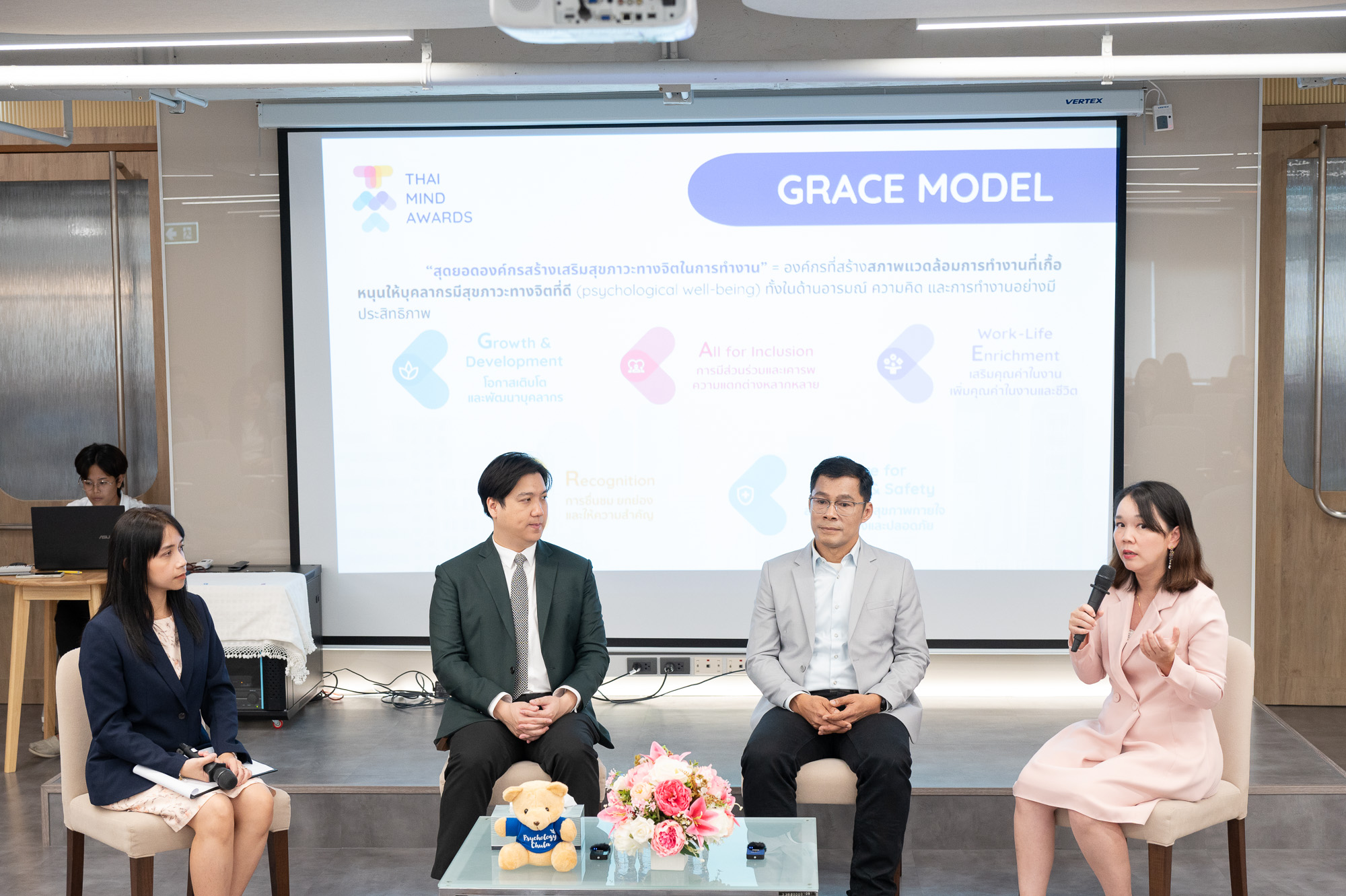 ภายหลังการเปิดงาน มีการเสวนาในหัวข้อ “การเข้าร่วมการคัดเลือกสุดยอดองค์กรสร้างเสริมสุขภาวะทางจิต Thai Mind Awards” ดำเนินรายการโดย ผศ. ดร.หยกฟ้า อิศรานนท์