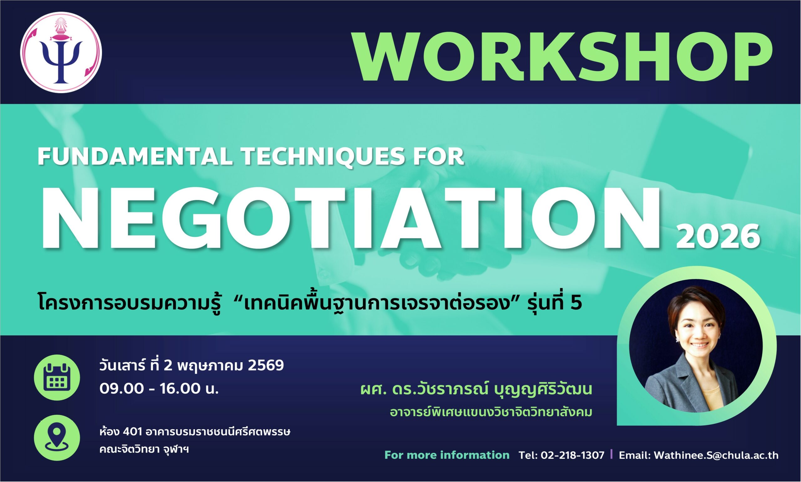คณะจิตวิทยา จุฬาลงกรณ์มหาวิทยาลัย ขอเชิญผู้สนใจเข้าร่วมโครงการอบรมความรู้ทางจิตวิทยา หัวข้อ “เทคนิคพื้นฐานสำหรับการเจรจาต่อรอง รุ่นที่ 4” ประจำปี 2568 ในวันเสาร์ที่ 22 มีนาคม 2568 เวลา 09.00 – 16.00 น. ณ ห้อง 614 ชั้น 6 อาคารบรมราชชนนีศรีศตพรรษ คณะจิตวิทยา จุฬาลงกรณ์มหาวิทยาลัย โดย ผู้ช่วยศาสตราจารย์ ดร.วัชราภรณ์ บุญญศิริวัฒน์ อาจารย์พิเศษแขนงวิชาจิตวิทยาสังคม คณะจิตวิทยา จุฬาลงกรณ์มหาวิทยาลัย เป็นวิทยากร