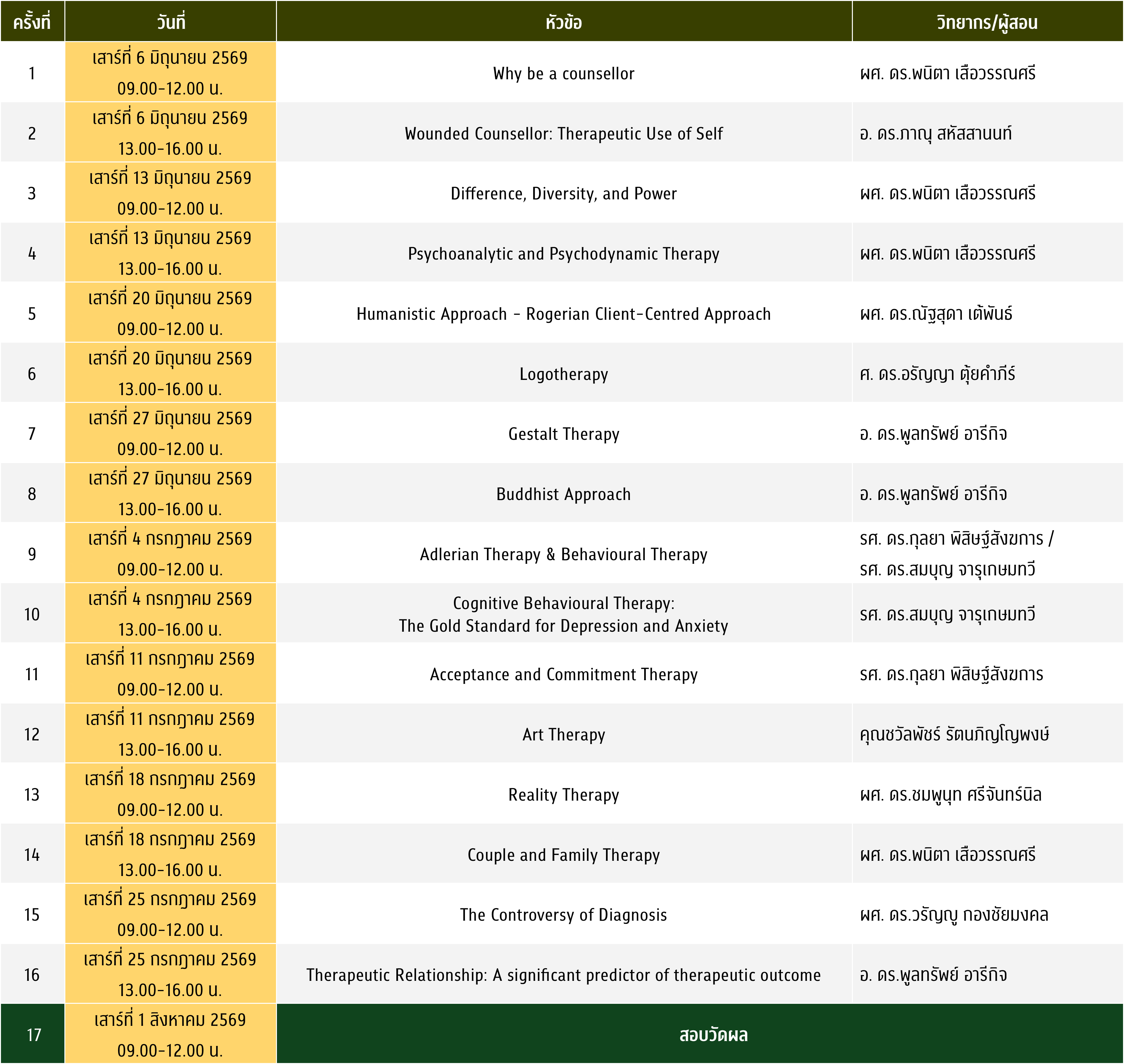 ปฏิทินโครงการอบรมความรู้ทางจิตวิทยา ปี 2569