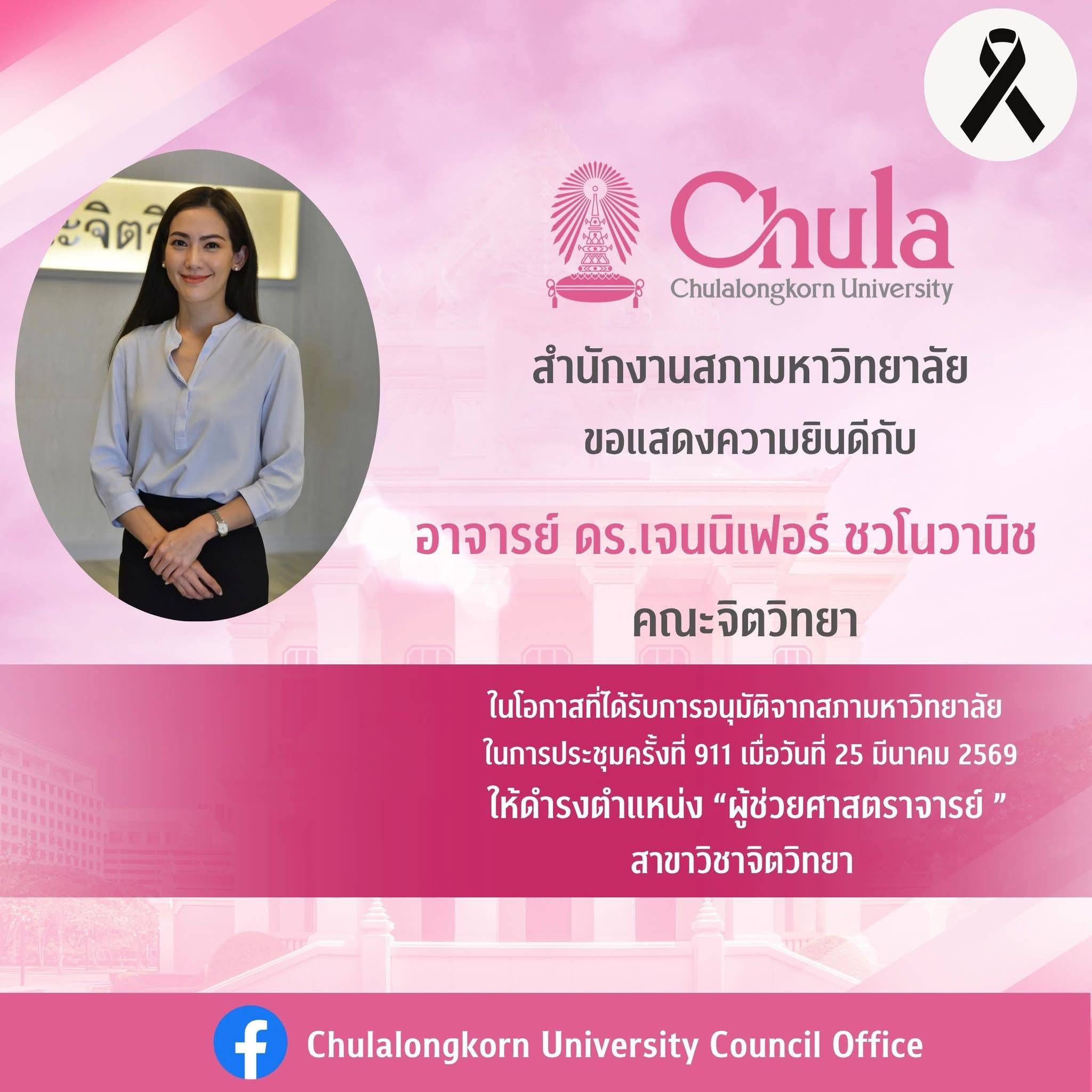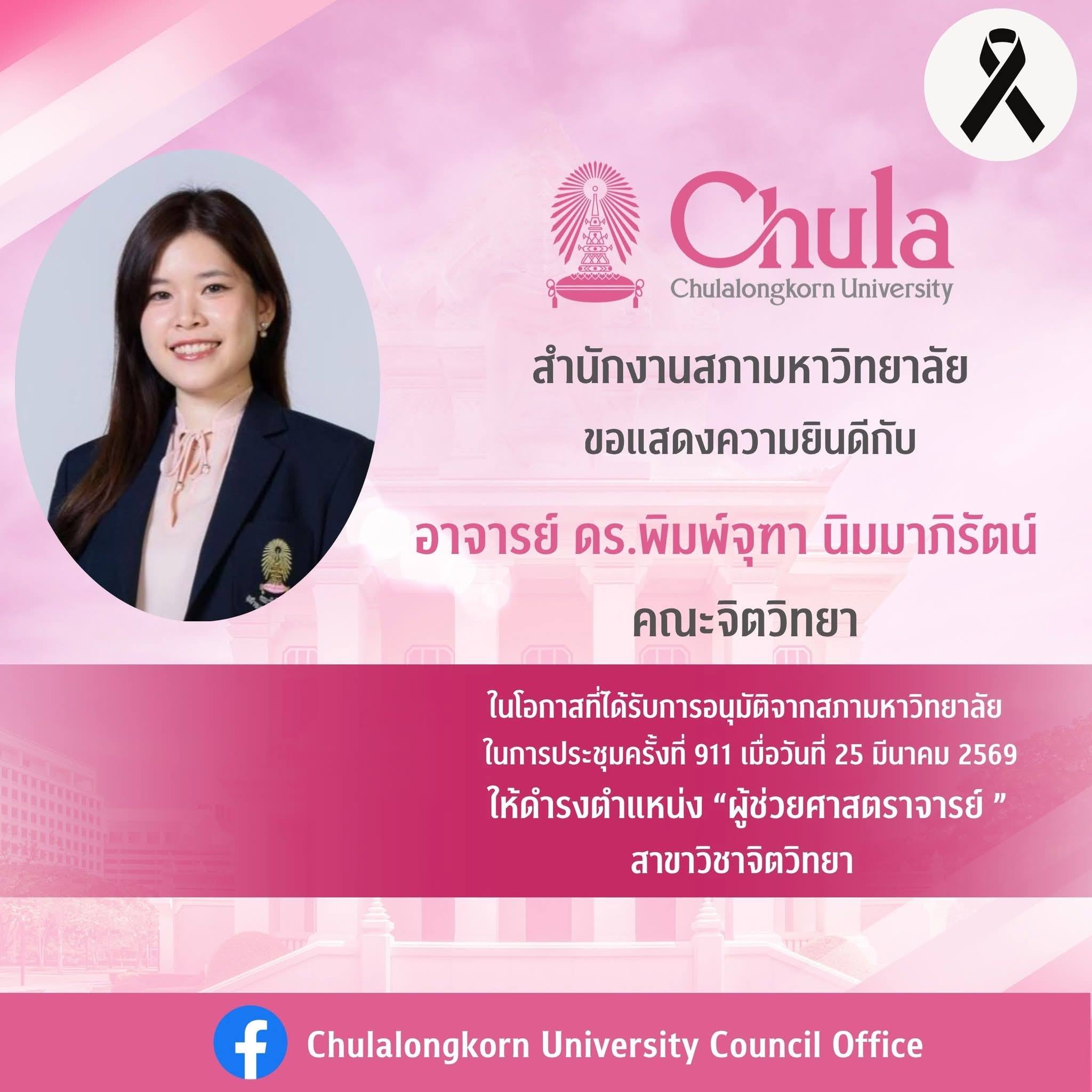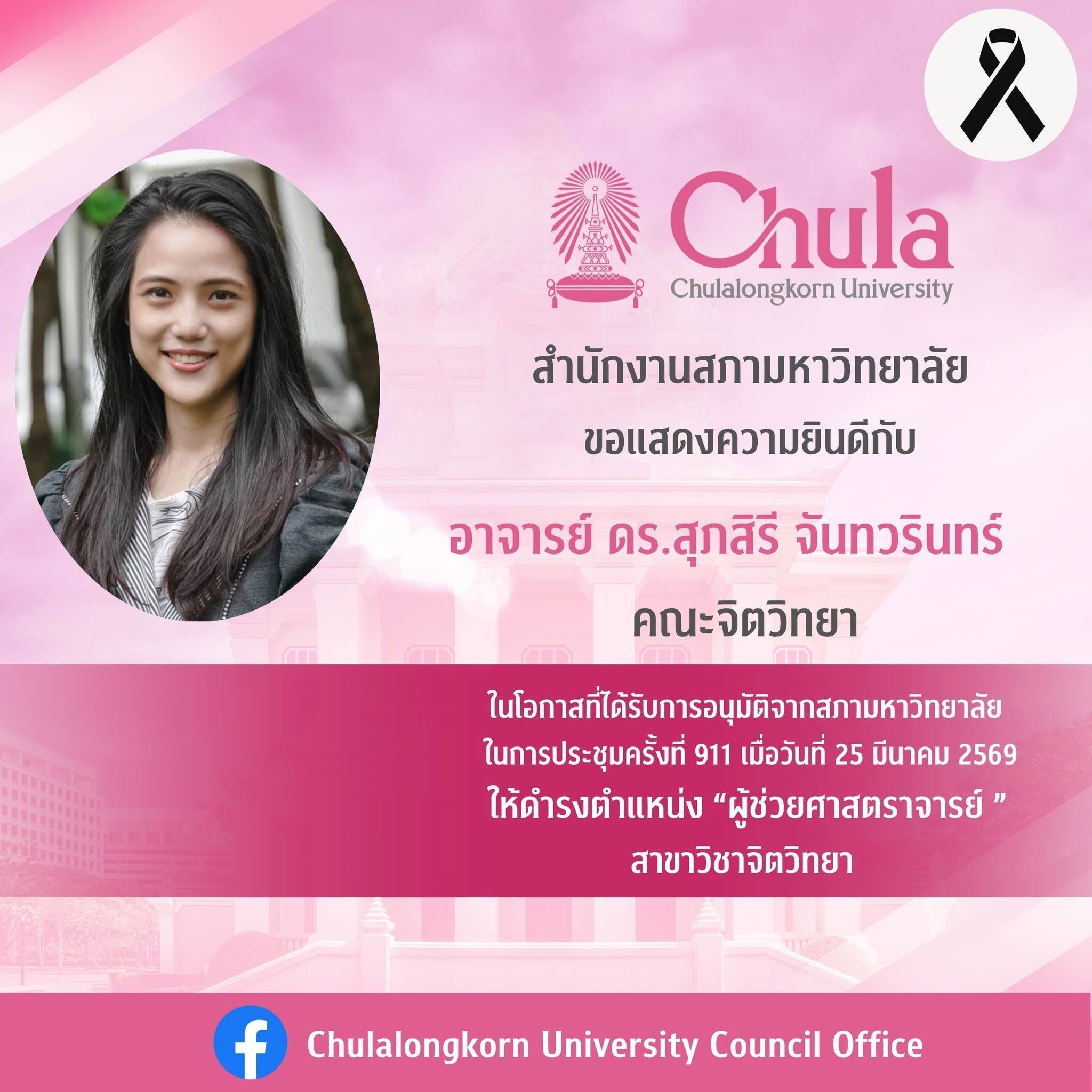 ที่ได้รับแต่งตั้งให้ดำรงตำแหน่ง “ผู้ช่วยศาสตราจารย์” สาขาวิชาจิตวิทยา โดยการอนุมัติจากสภามหาวิทยาลัย ในการประชุมครั้งที่ 911 วันที่ 25 มีนาคม 2569