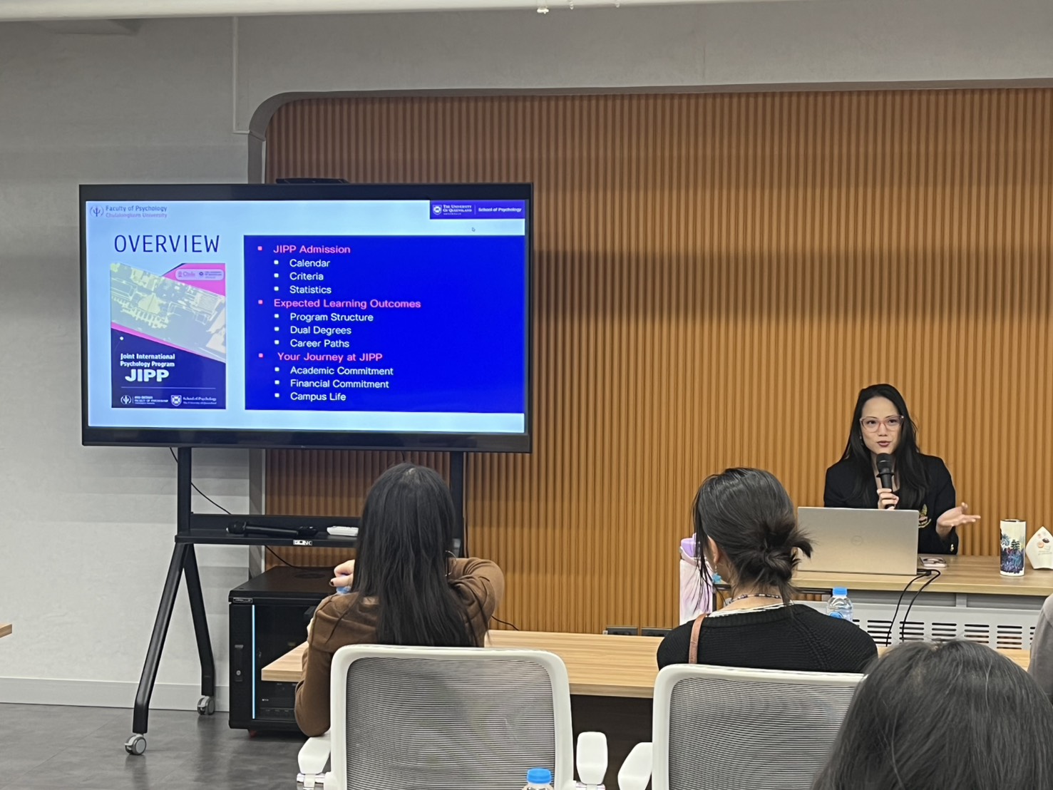 คณะจิตวิทยาหลักสูตรนานาชาติ (JIPP) ได้แนะแนวหลักสูตรให้แก่นักเรียนโรงเรียนนานาชาติปัญญาเด่น จ. เชียงใหม่ โดยมี อาจารย์ ดร.สุภสิรี จันทวรินทร์ ประธานแขนงวิชาจิตวิทยาปริชาน เป็นผู้บรรยาย พร้อมทั้งพานักเรียนเยี่ยมชมการให้บริการและสภาพแวดล้อมของคณะจิตวิทยา จุฬาฯ เมื่อวันศุกร์ที่ 21 พฤศจิกายน 2568 ที่ผ่านมา