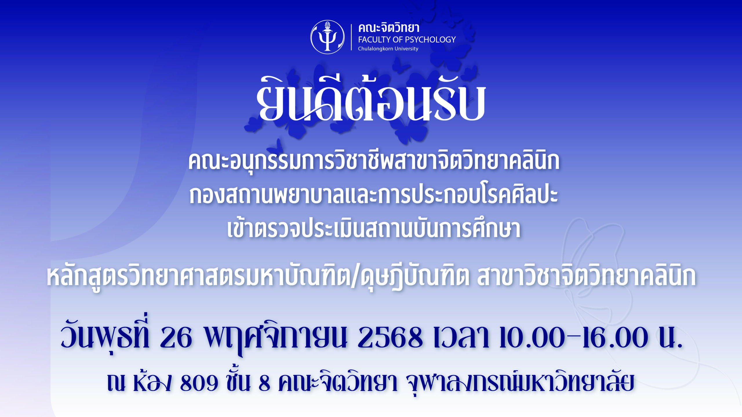 วันที่ 26 พฤศจิกายน 2568 นี้ คณะจิตวิทยา จุฬาลงกรณ์มหาวิทยาลัย โดยมีคณบดีคณะจิตวิทยา (ผู้ช่วยศาสตราจารย์ ดร.ณัฐสุดา เต้พันธ์) รองศาสตราจารย์ ดร.สมบุญ จารุเกษมทวี รองศาสตราจารย์ ดร.กุลยา พิสิษฐ์สังฆการ ผู้ช่วยศาสตราจารย์ ดร.อภิชญา ไชยวุฒิกรวานิช และคุณวัลลภ สีหเดชวีระ ให้การต้อนรับคณะอนุกรรมการวิชาชีพ สาขาจิตวิทยาคลินิก กองสถานพยาบาลและการประกอบโรคศิลปะ เพื่อตรวจประเมินสถาบันการศึกษาที่จัดการเรียนการสอนสาขาจิตวิทยาคลินิก โดยทั้ง 2 หลักสูตรอยู่ในระหว่างการประเมินผลการรับรอง