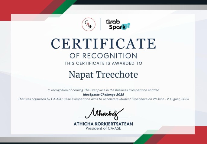 ได้รับรางวัลชนะเลิศ จาก 531 ทีม จัดโดย องค์กร CA-ASE และ บริษัท Grab Thailand แข่งเมื่อวันที่ 27 มิถุนายน 2568 – 2 สิงหาคม 2568