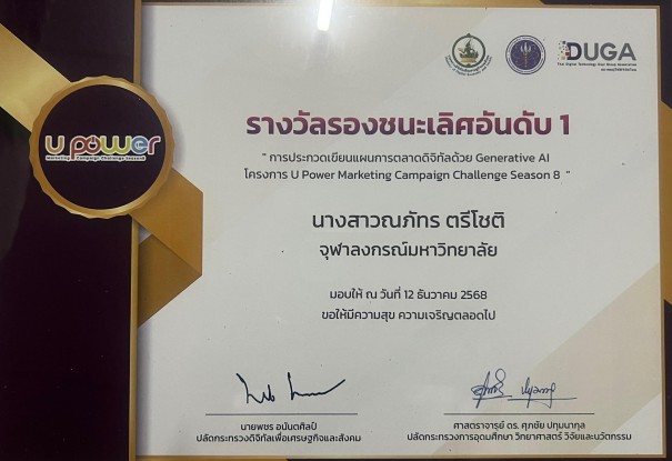 ได้รับรางวัลชนะเลิศอันดับที่ 1 และทุนการศึกษาสนับสนุนจากแบรนด์ Say Ohh จัดโดยกระทรวงดิจิทัลเพื่อเศรษฐกิจและสังคม (MDES) และสมาคมผู้ใช้ดิจิทัลไทย (DUGA) ร่วมกับแบรนด์ 10 องค์กร แข่งเมื่อวันที่ 10 กันยายน 2568 – 12 ธันวาคม 2568
