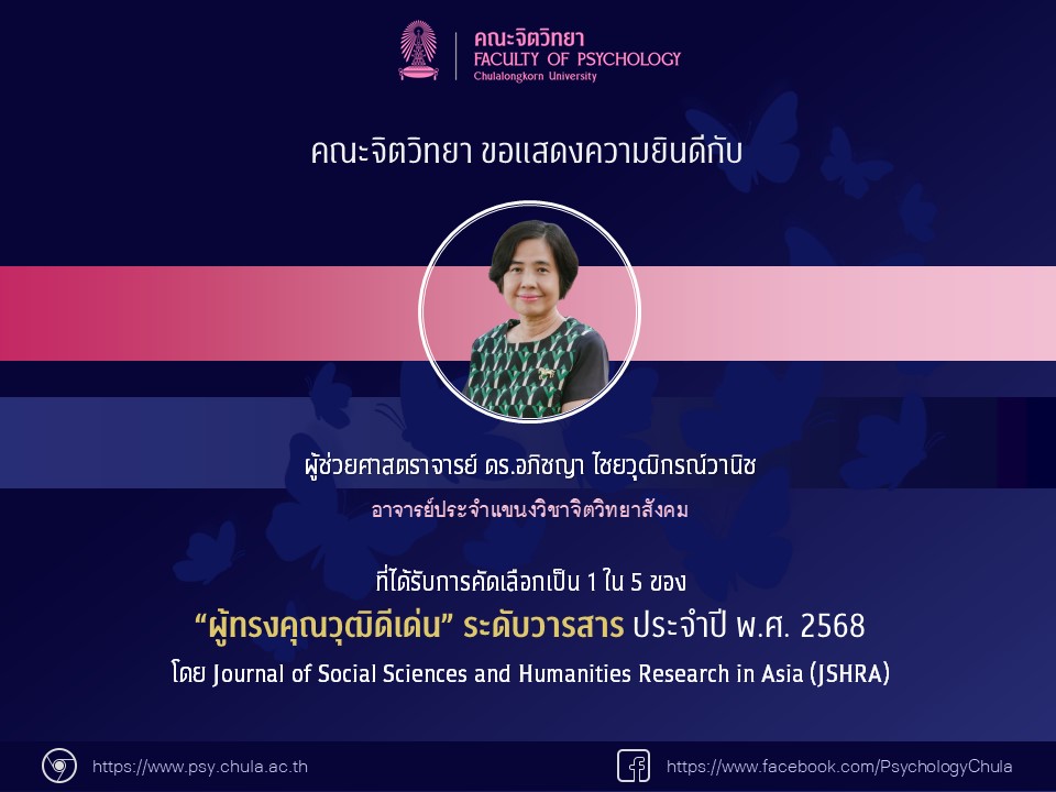 คณะจิตวิทยา ขอแสดงความยินดีกับ ผู้ช่วยศาสตราจารย์ ดร.อภิชญา ไชยวุฒิกรณ์วานิช อาจารย์ประจำแขนงวิชาจิตวิทยาสังคม คณะจิตวิทยา จุฬาฯ ที่ได้รับการคัดเลือกเป็น 1 ใน 5 ของ ผู้ทรงคุณวุฒิดีเด่น ระดับวารสาร ประจำปี พ.ศ. 2568 โดย Journal of Social Sciences and Humanities Research in Asia (JSHRA)
