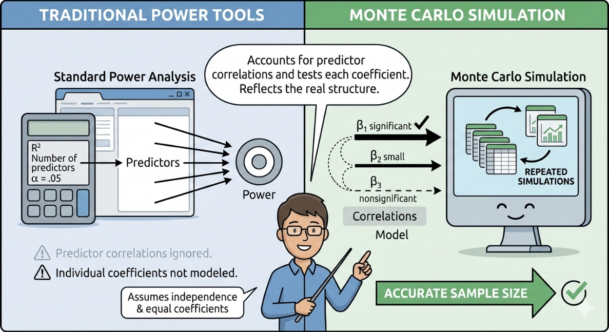 ความแตกต่างระหว่างการจำลองข้อมูลด้วยเทคนิค Monte Carlo และการวิเคราะห์อำนาจการทดสอบทางสถิติเชิงทฤษฎี (เช่น G*Power) สำหรับการวิเคราะห์สมการถดถอยพหุ