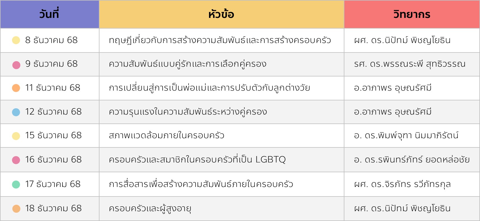 งานบริการวิชาการ ร่วมกับ ศูนย์จิตวิทยาพัฒนาการและความสัมพันธ์ระหว่างวัย คณะจิตวิทยา จุฬาลงกรณ์มหาวิทยาลัย ขอเชิญผู้สนใจเข้าร่วม โครงการอบรมความรู้ทางจิตวิทยาครอบครัว (Family Psychology) ประจำปี 2568 โดย อบรมผ่านโปรแกรม ZOOM ระหว่างวันที่ 8-18 ธันวาคม 2568 เวลา 18.00 – 21.00 น. รวมใช้ระยะเวลาในการฝึกอบรมทั้งสิ้น 24 ชั่วโมง อบรมโดยคณาจารย์แขนงวิชาจิตวิทยาพัฒนาการ คณะจิตวิทยา จุฬาลงกรณ์มหาวิทยาลัย