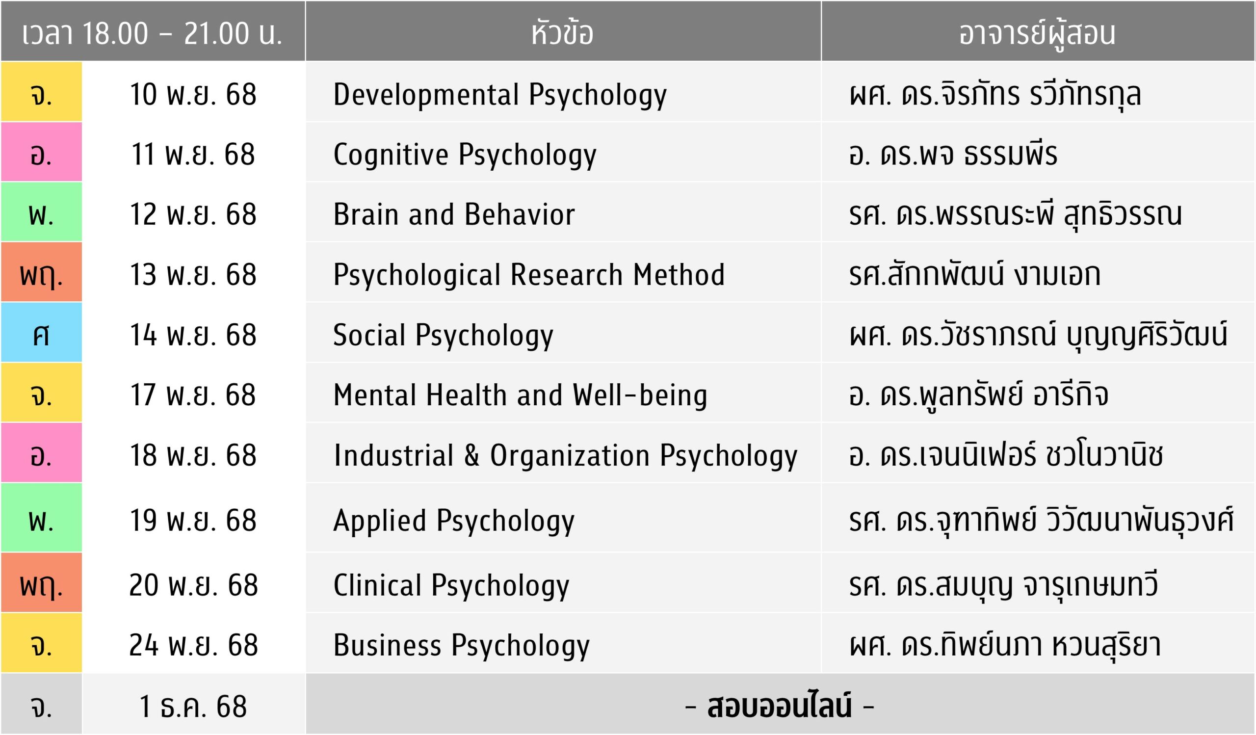 คณะจิตวิทยา จุฬาลงกรณ์มหาวิทยาลัย ขอเชิญผู้สนใจเข้าร่วมโครงการอบรมความรู้ทางจิตวิทยาสำหรับประชาชนทั่วไป ประจำปี 2568 ซึ่งจะจัดอบรมแบบออนไลน์ผ่านแอพพลิเคชั่น ZOOM ระหว่างวันที่ 10 พ.ย. – 1 ธ.ค. 2568 (วันจันทร์-ศุกร์) เวลา 18.00 – 21.00 น. รวมใช้ระยะเวลาในการฝึกอบรมและสอบวัดผลทั้งสิ้น 30 ชั่วโมง โดย คณาจารย์ประจำแขนงวิชาต่าง ๆ ของ คณะจิตวิทยา จุฬาลงกรณ์มหาวิทยาลัย เป็นวิทยากร