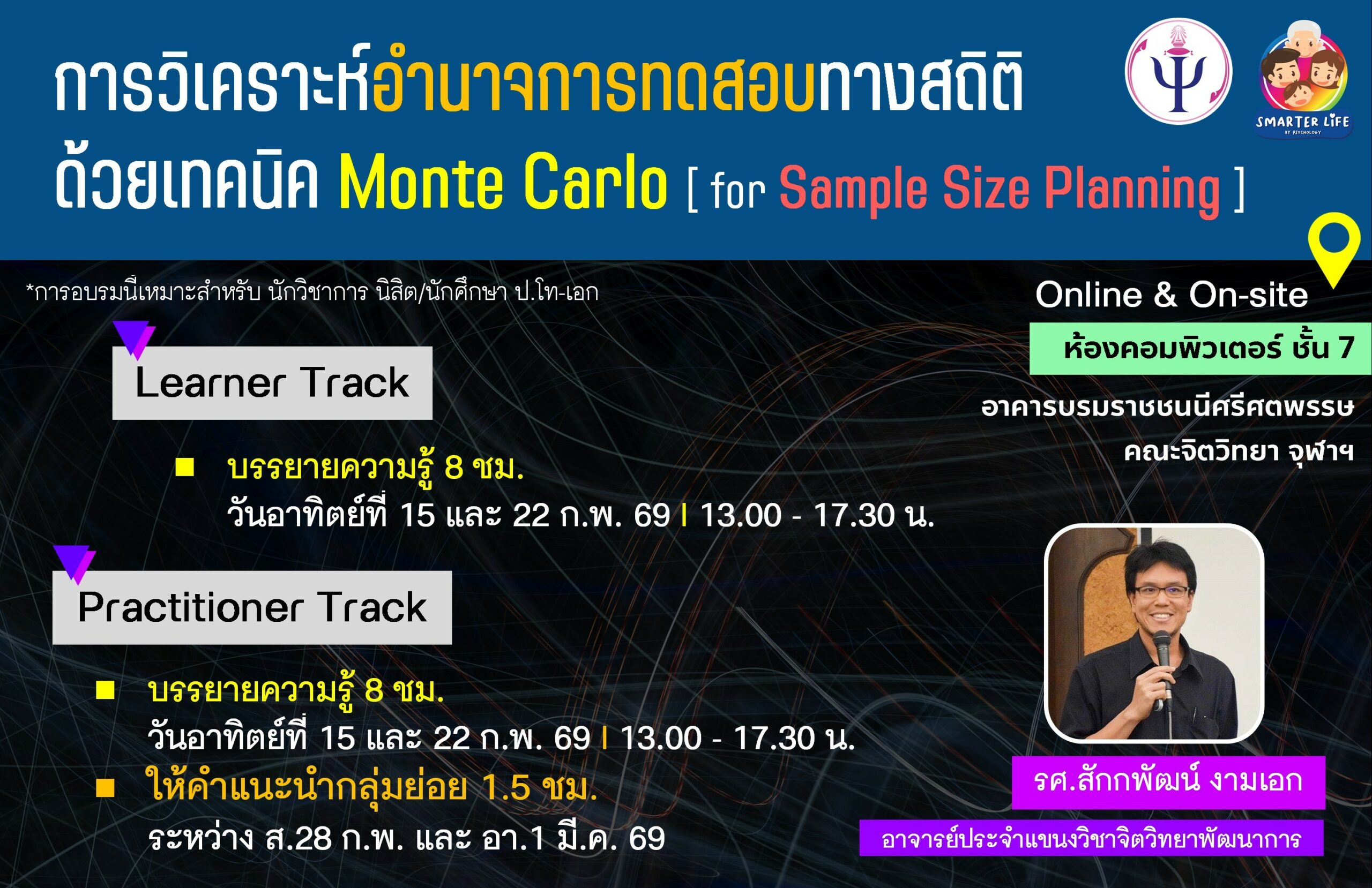 • บรรยายความรู้ ระยะเวลา 8 ชั่วโมง ในวันอาทิตย์ที่ 15 และ 22 กุมภาพันธ์ 2569 เวลา 13.00 – 17.30 น. ณ ห้องคอมพิวเตอร์ ชั้น 7 อาคารบรมราชชนนีศรีศตพรรษ คณะจิตวิทยา จุฬาลงกรณ์มหาวิทยาลัย หรือ ออนไลน์ผ่านโปรแกรม Zoom meeting