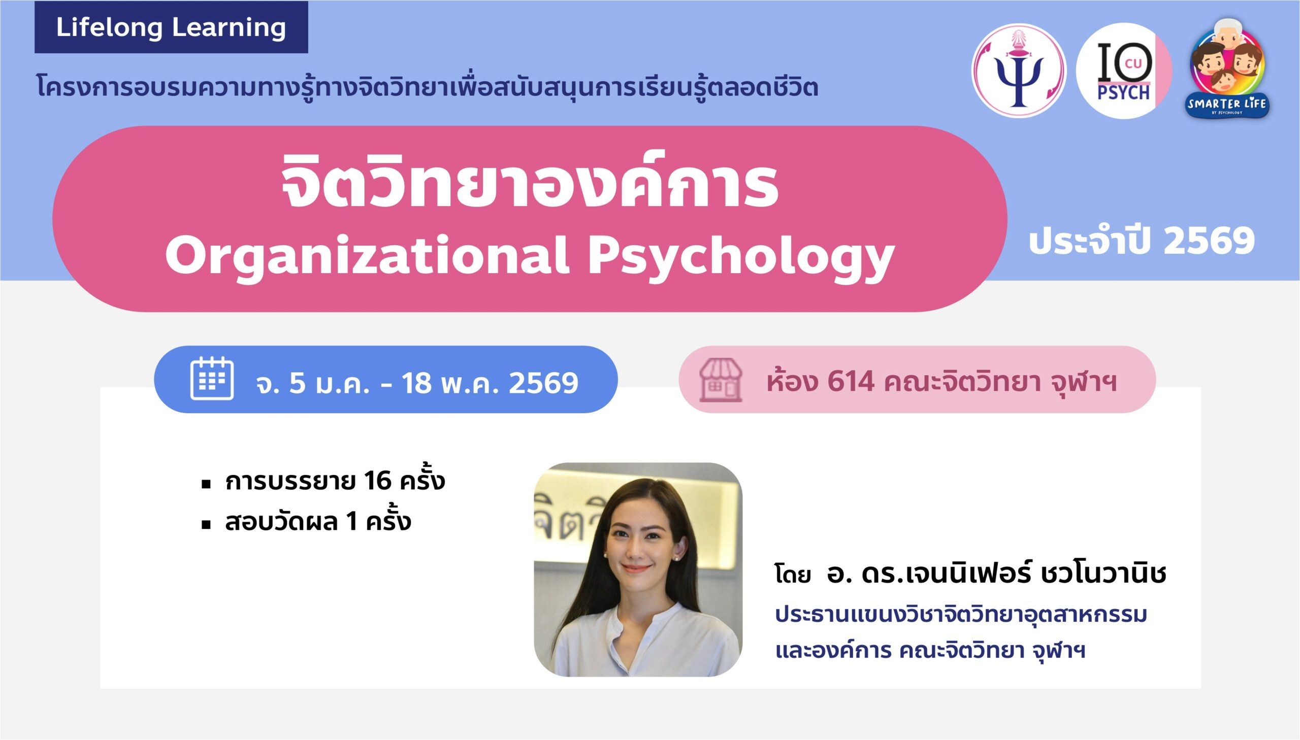 ‘โครงการอบรมความทางรู้ทางจิตวิทยาเพื่อสนับสนุนการเรียนรู้ตลอดชีวิต (Lifelong Learning) หัวข้อ จิตวิทยาองค์การ (Organizational Psychology) เป็นโครงการสําหรับเพิ่มความรู้และทักษะให้แก่ผู้ที่สนใจศึกษาศาสตร์ทางด้านจิตวิทยาองค์การ เพื่อทำความเข้าใจพฤติกรรมของบุคคลและกลุ่มในที่ทำงาน วิเคราะห์ปัจจัยด้านแรงจูงใจ การเป็นผู้นำ วัฒนธรรมองค์กร และกระบวนการทำงาน จากการประยุกต์หลักจิตวิทยาเพื่อเพิ่มประสิทธิภาพการทำงานและความเป็นอยู่ที่ดีของพนักงาน รวมถึงการคาดหวังว่าผู้ที่ผ่านการเรียนไปนั้น จะสามารถนําศาสตร์ทางจิตวิทยาองค์การไปประยุกต์ความรู้ใช้ในองค์กรให้เกิดประสิทธิภาพต่อบุคลากรและองค์กรมากยิ่งขึ้น