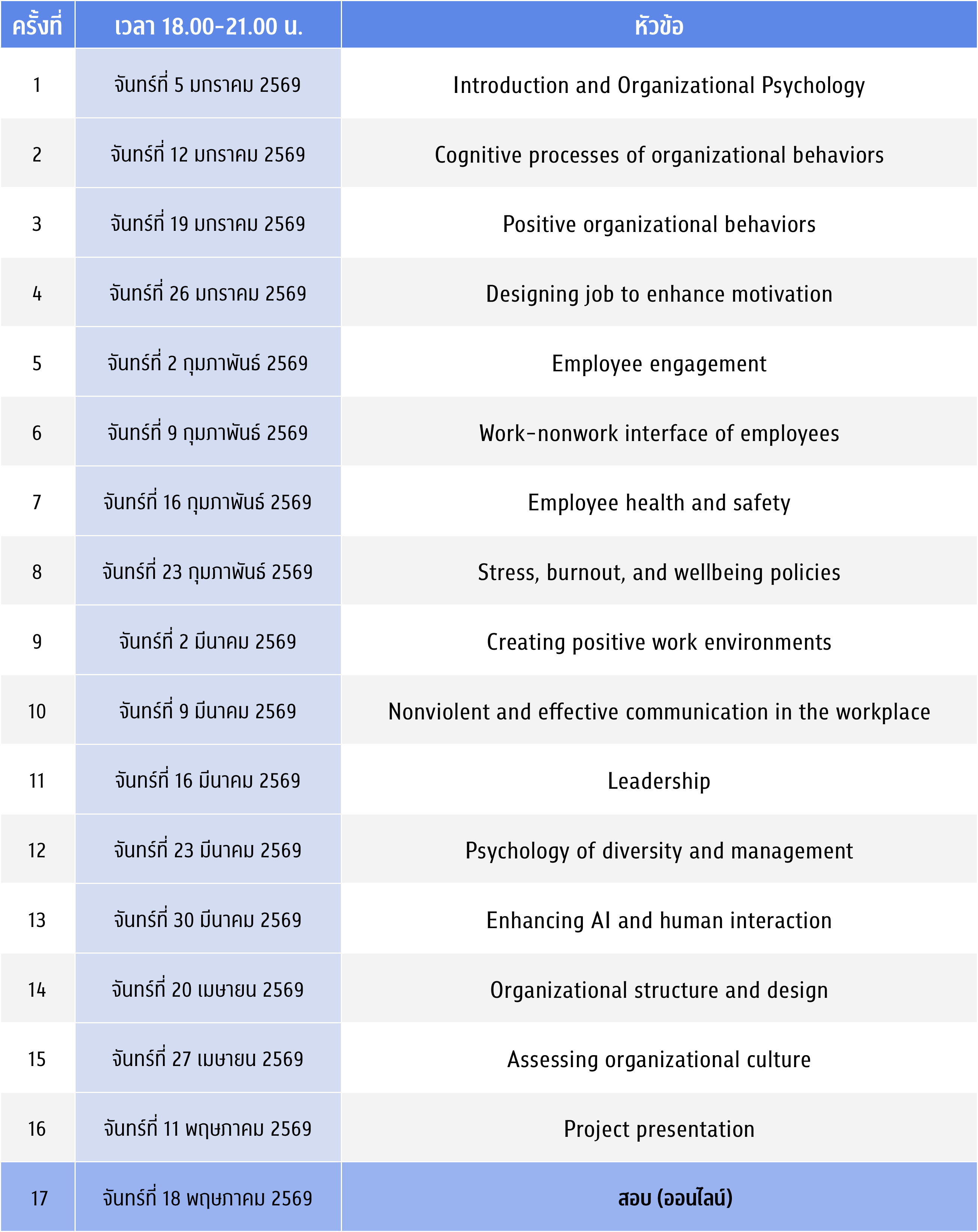 • คุณสมบัติผู้เรียน – เคยผ่านรายวิชา/โครงการอบรม จิตวิทยาอุตสาหกรรมและองค์การ หรือเทียบเท่า
