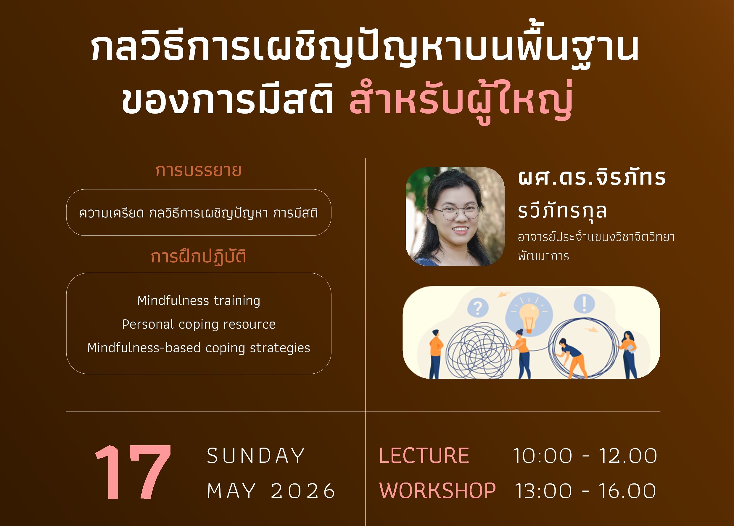 ด้วยเหตุนี้ โครงการฝึกอบรม “การเผชิญปัญหาบนพื้นฐานของการมีสติ สำหรับผู้ใหญ่” จึงถูกพัฒนาขึ้น โดยมุ่งหวังที่จะมอบความรู้ความเข้าใจเกี่ยวกับความเครียด กลวิธีการเผชิญปัญหา และความสำคัญของการมีสติ ควบคู่ไปกับการฝึกปฏิบัติผ่านกิจกรรม Workshop เพื่อให้ผู้เข้าร่วมได้เรียนรู้และประยุกต์ใช้การมีสติเป็นเครื่องมือในการเลือกกลยุทธ์การจัดการความเครียดที่เหมาะสมกับตนเอง ซึ่งจะนำไปสู่การมีสุขภาวะทางจิตใจที่ดีขึ้นและสามารถรับมือกับความท้าทายต่าง ๆ ในชีวิตได้อย่างมีประสิทธิภาพและยั่งยืน